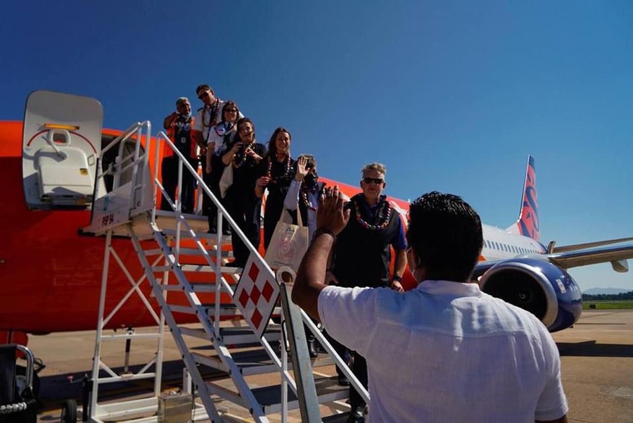 Los pasajeros de la ciudad de Minneapolis tuvieron recepción especial por parte del Gobierno Municipal de Zihuatanejo y la Oficina de Convenciones y Visitantes, quienes les obsequiaron souvenirs y amenizaron su llegada con mariachis.
