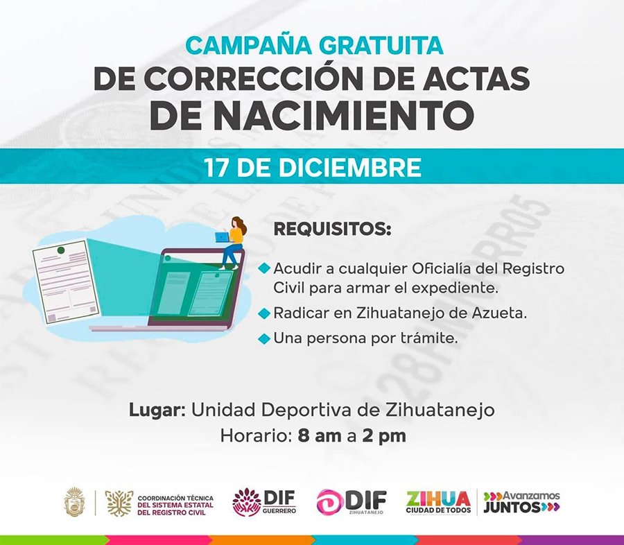 Zihuatanejo ,.Gro . A 16 de Diciembre del 2021.-Como parte de las acciones de apoyo a la economía de las familias de Zihuatanejo de Azueta, el gobierno que encabeza el presidente Jorge Sánchez Allec, en un esfuerzo conjunto con la Coordinación Técnica del Sistema Estatal del Registro Civil y el DIF Municipal, llevará a cabo este viernes, 17 de diciembre, una campaña gratuita de Corrección de Actas de Nacimiento en las canchas techadas de la Unidad Deportiva, donde desde las 8 de la mañana hasta las dos de la tarde personal de la dirección del Registro Civil, bajo la coordinación del titular de la dependencia, Francisco Gutiérrez Fierro, atenderá a todas las personas que requieran de este servicio.