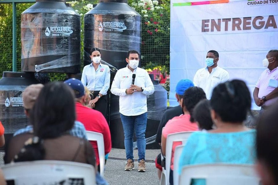 Zihuatanejo,Gro., A 05 de Enero del 2022.-El presidente Jorge Sánchez Allec, junto a su esposa Lizette Tapia Castro y el director de Desarrollo Social Adín Escobar Silva, encabezó este miércoles la primera entrega del año 2022 del programa de Apoyos Subsidiados, que en esta ocasión consistieron en tinacos para almacenamiento de agua potable, con los cuales se benefició a más de 50 familias que habitan en diferentes colonias y comunidades de Zihuatanejo de Azueta.