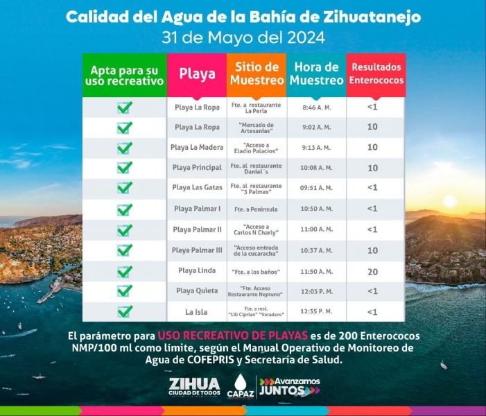 Cómo es costumbre previo a las distintas temporadas vacacionales en nuestro destino, la COFEPRIS realiza el análisis para verificar si las aguas marinas de Ixtapa Zihuatanejo son aptas para su uso recreativo , la Comisión del Agua Potable y Alcantarillado de Zihuatanejo (CAPAZ), por instrucciones del Presidente Jorge Sánchez Allec ha dispuesto que el organismo realice de manera rutinaria mes a mes el muestreo de agua de las diferentes playas, para analizarlas en su propio laboratorio, con el fin de establecer un comparativo con el que realiza la COFEPRIS.