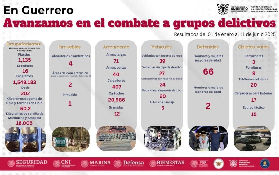 Chilpancingo, Gro., 13 de junio de 2025.- Como resultado de las acciones coordinadas entre el Gobierno del Estado de Guerrero y la Secretaría de la Defensa Nacional, se han logrado avances contundentes en el combate a grupos delictivos en la entidad, informó la Mesa de Coordinación para la Construcción de Paz en Guerrero, al presentar el informe correspondiente al 1 de enero al 11 de junio del presente año.