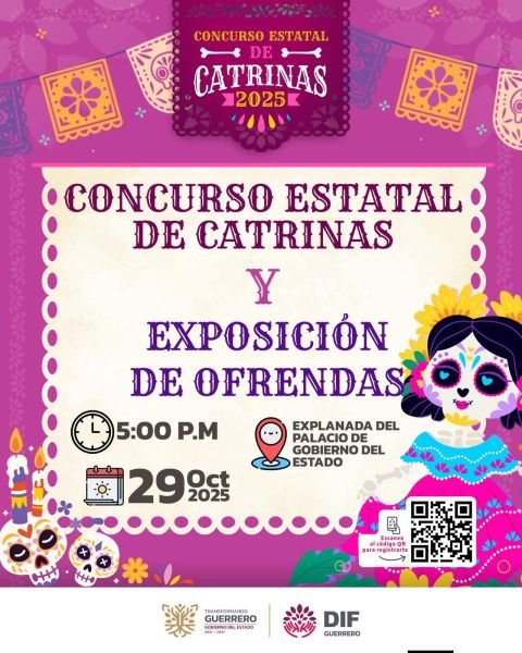 Chilpancingo, Gro., 23 de octubre de 2025.- En el marco de la celebración del Día de Muertos 2025, el gobierno del estado, a través del Sistema DIF Guerrero, llevarán a cabo el tradicional Concurso Estatal de Catrinas, donde podrá participar la población en general, resaltando que las inscripciones quedan abiertas a partir de la publicación de la convocatoria, misma que se encuentra publicada en la página oficial del gobierno del estado y del DIF Guerrero.