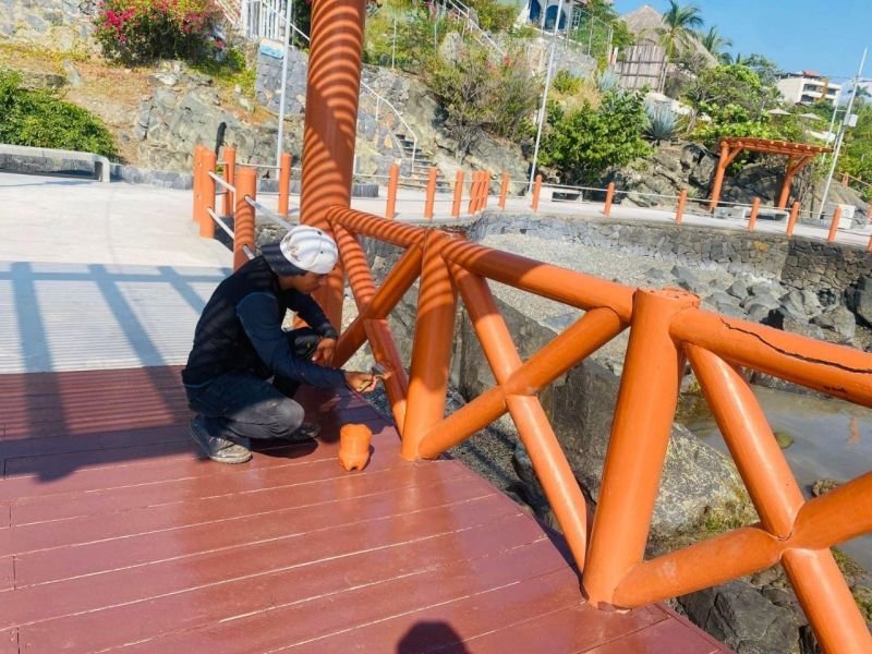 Palacios Pineda agregó que también se realizan trabajos de remozamiento con pintura en el Paseo del Pescador, desde el muelle principal y el museo hasta llegar a Playa La Madera, aplicando pintura en bolardos y partes de fachadas que se encontraban desgastadas. Asimismo, se atendió Capricho del Rey y los accesos a playa en la zona de Ixtapa, como La Cucaracha, Carlos and Charlie’s y Playa El Palmar I, II y III.