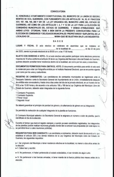 La union de Isidoro Montes de Oca, Gro., 23 mayo 2025,- Después de una minuciosa planificación y revisión por parte del presidente municipal José Francisco Suazo Espino y el Cabildo en general, el Ayuntamiento de La Unión aprobó oficialmente los acuerdos, bases y requisitos para la convocatoria de la elección de comisarios y delegados municipales, tanto propietarios como suplentes.
